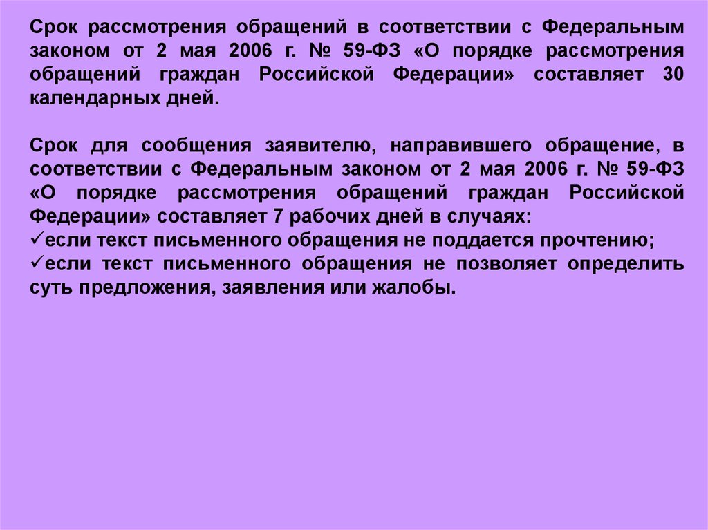 Срок рассмотрения обращений в соответствии с Федеральнымзаконом от 2 мая 2006 г. № 59-ФЗ «О порядке рассмотрения