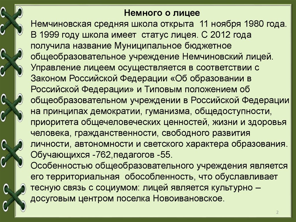 Немного о лицееНемчиновская средняя школа открыта 11 ноября 1980 года.