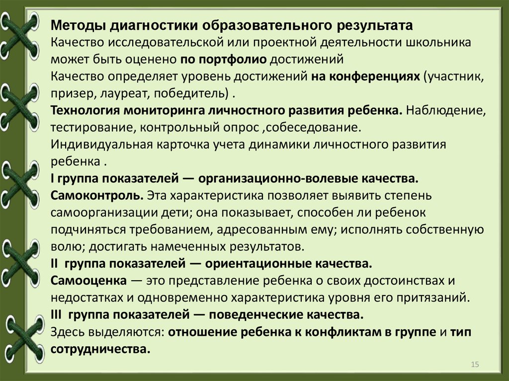 Методы диагностики образовательного результатаКачество исследовательской или проектной деятельности школьника