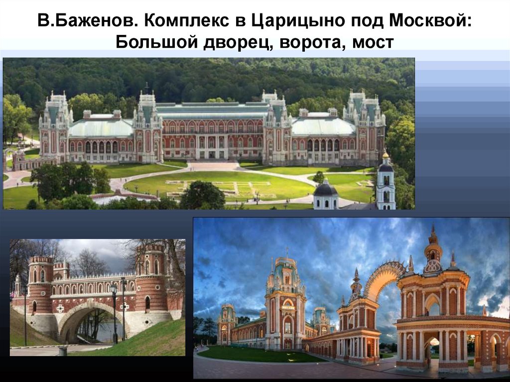 В.Баженов. Комплекс в Царицыно под Москвой:Большой дворец, ворота, мост