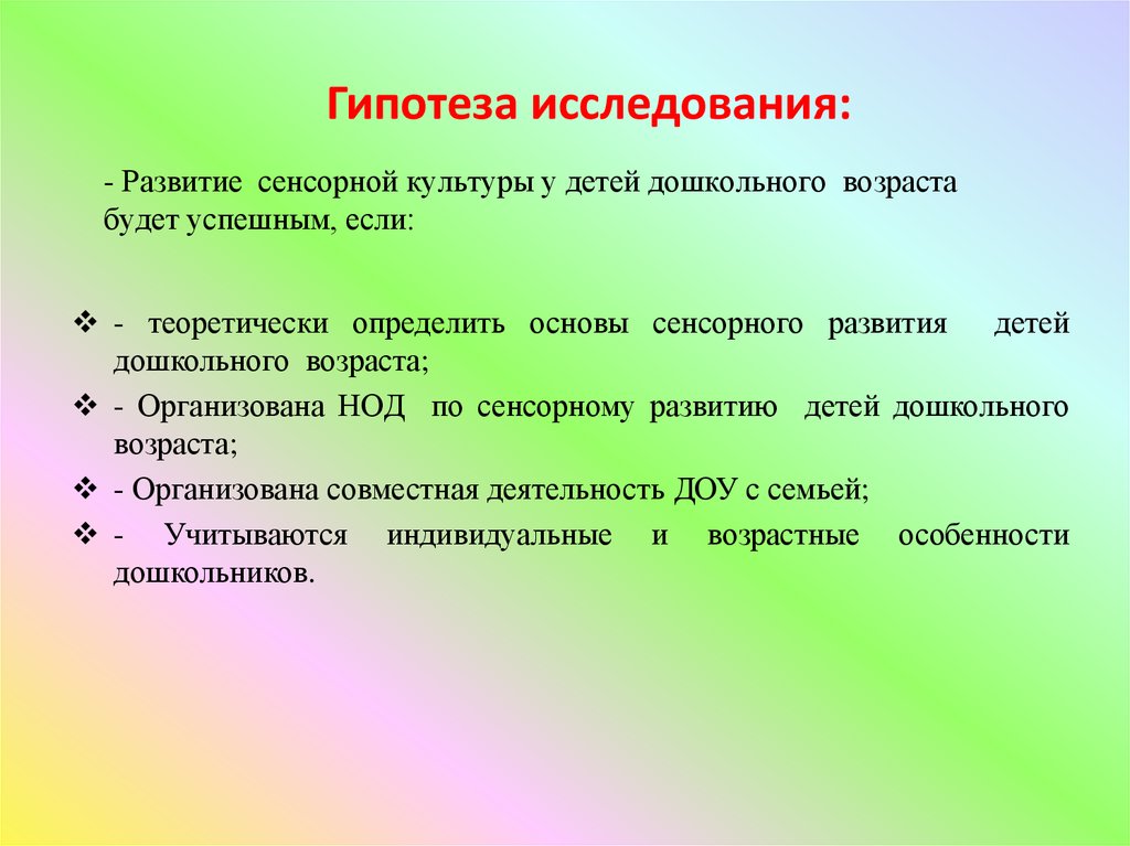 Гипотеза исследования:- Развитие сенсорной культуры у детей дошкольного возраста