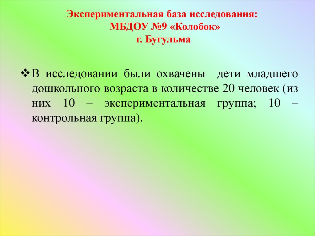 Экспериментальная база исследования:МБДОУ №9 «Колобок»