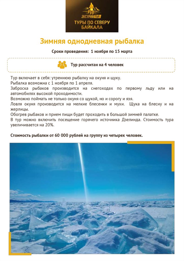 Зимняя однодневная рыбалкаСроки проведения: 1 ноября по 15 марта