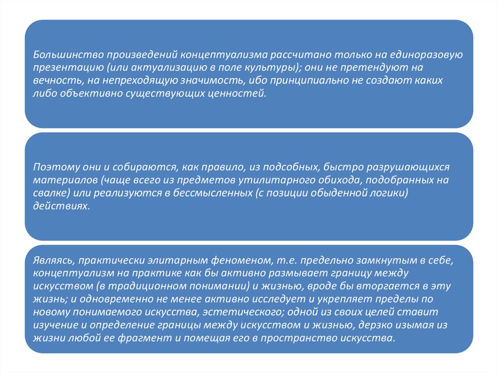 Большинство произведений концептуализма рассчитано только на единоразовуюпрезентацию (или актуализацию в поле культуры); они не претендуют на