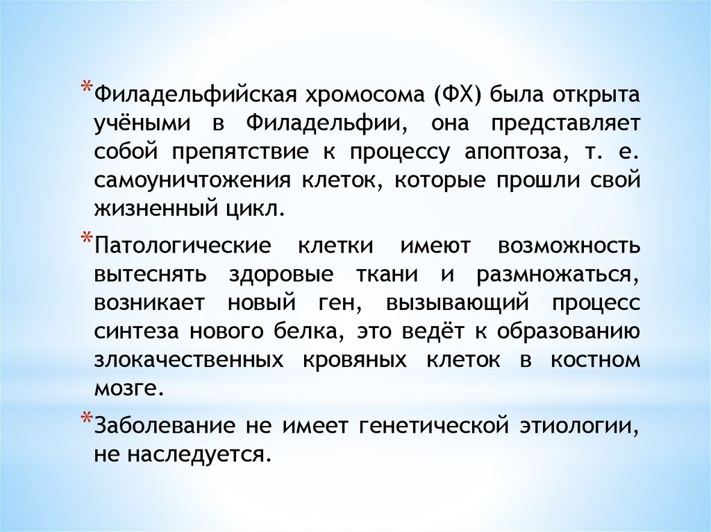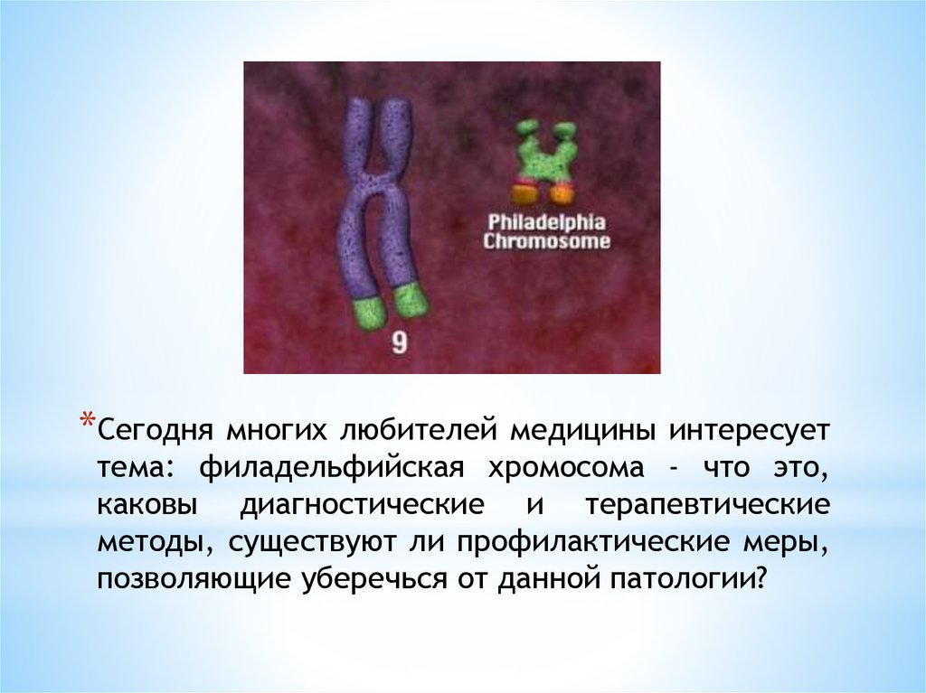 *Филадельфийская хромосома (ФХ) была открытаучёными в Филадельфии, она представляет