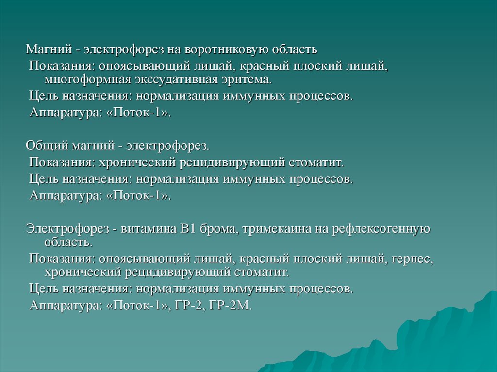 Магний - электрофорез на воротниковую областьПоказания: опоясывающий лишай, красный плоский лишай,