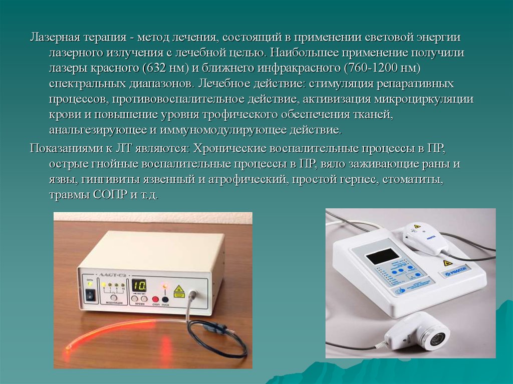 Лазерная терапия - метод лечения, состоящий в применении световой энергиилазерного излучения с лечебной целью. Наибольшее применение получили