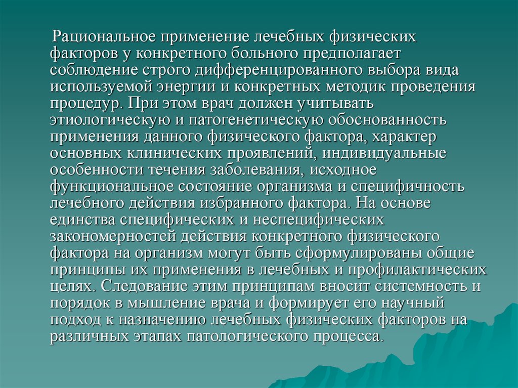 Рациональное применение лечебных физическихфакторов у конкретного больного предполагает