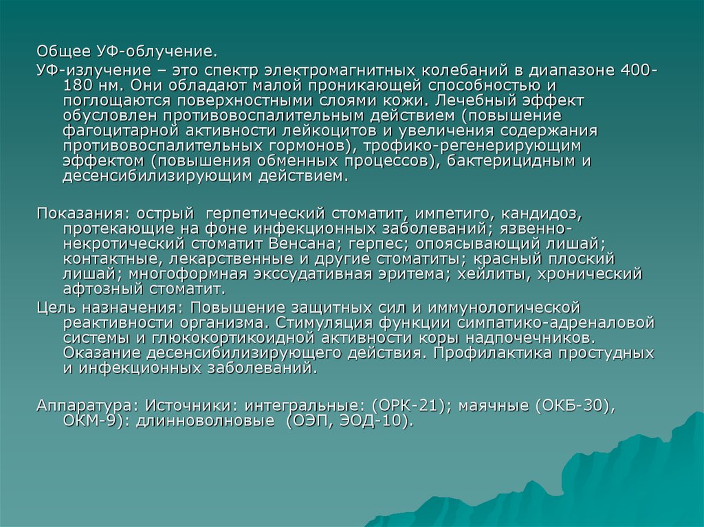 Общее УФ-облучение.УФ-излучение – это спектр электромагнитных колебаний в диапазоне 400180 нм. Они обладают малой проникающей способностью и