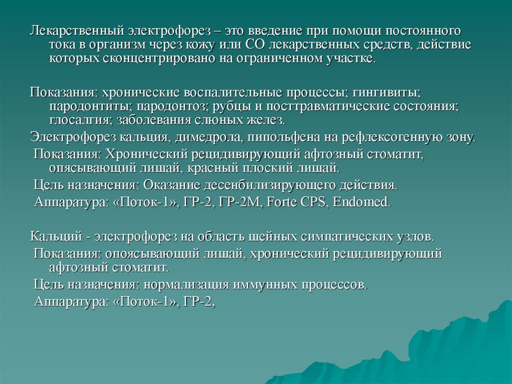 Лекарственный электрофорез – это введение при помощи постоянноготока в организм через кожу или СО лекарственных средств, действие