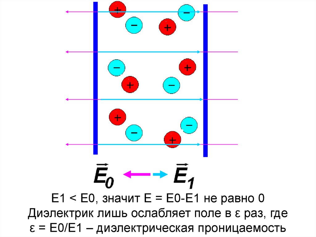 E1 < E0, значит E = E0-E1 не равно 0Диэлектрик лишь ослабляет поле в ε раз, где