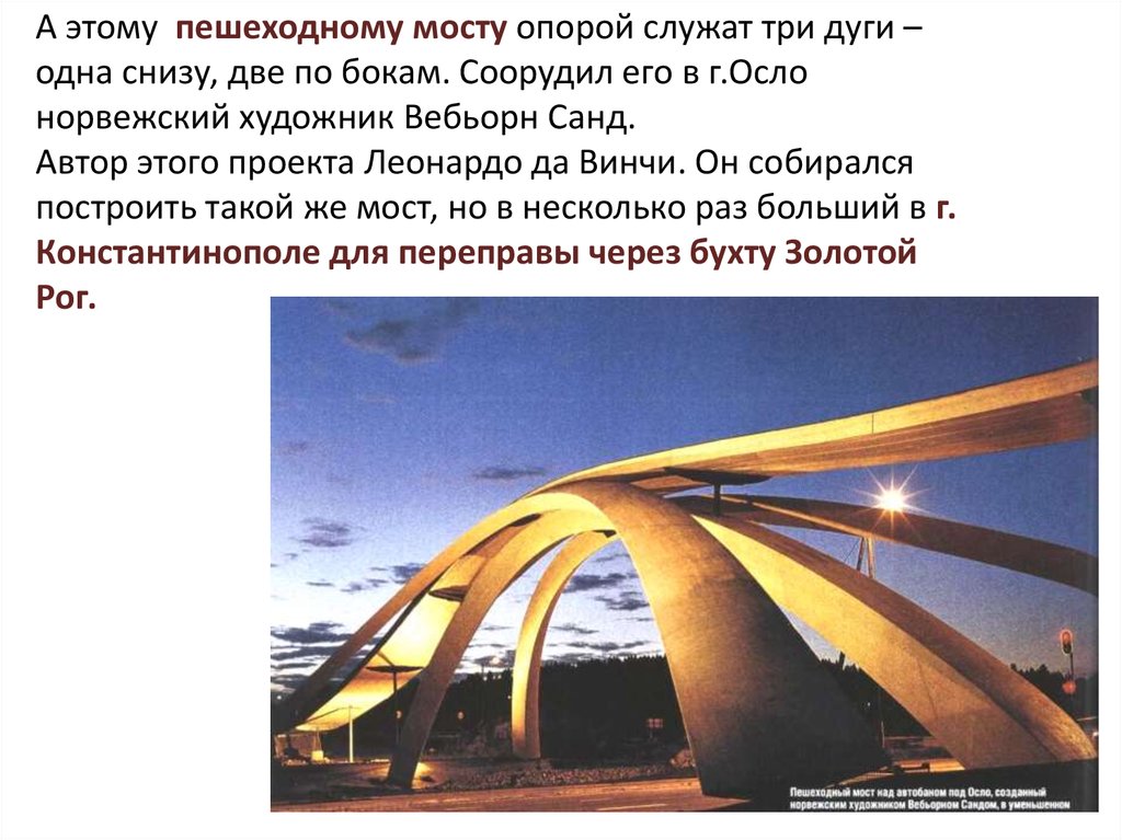 А этому пешеходному мосту опорой служат три дуги –одна снизу, две по бокам. Соорудил его в г.Осло