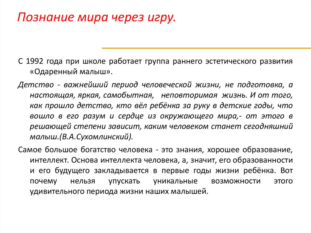 Познание мира через игру.С 1992 года при школе работает группа раннего эстетического развития