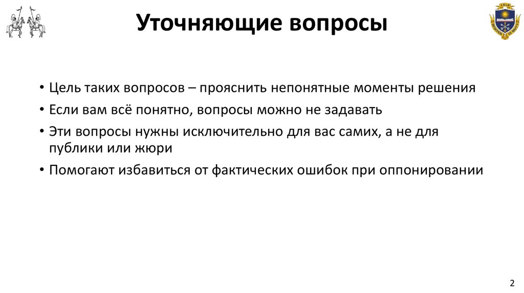 Уточняющие вопросы• Цель таких вопросов – прояснить непонятные моменты решения