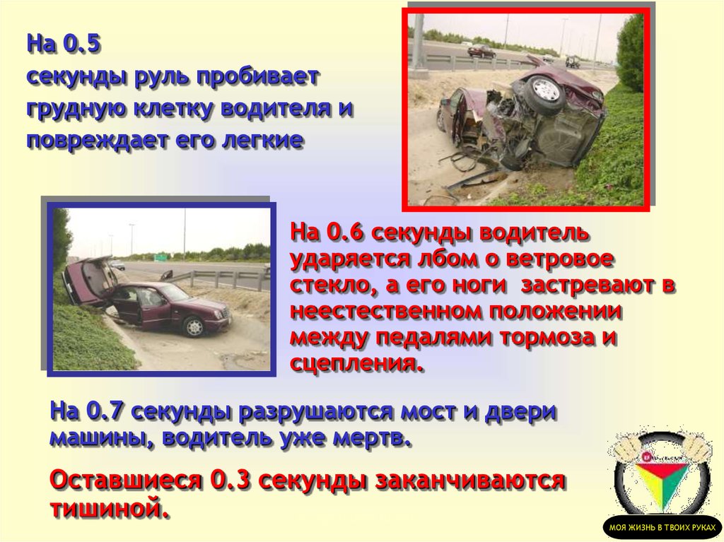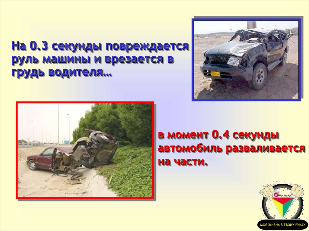 На 0.3 секунды повреждаетсяруль машины и врезается в