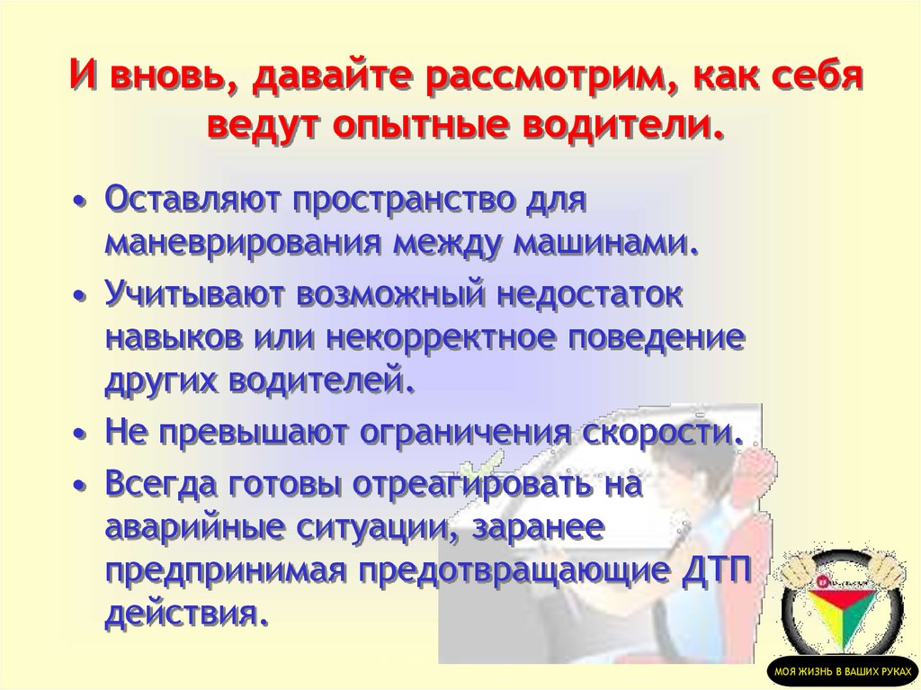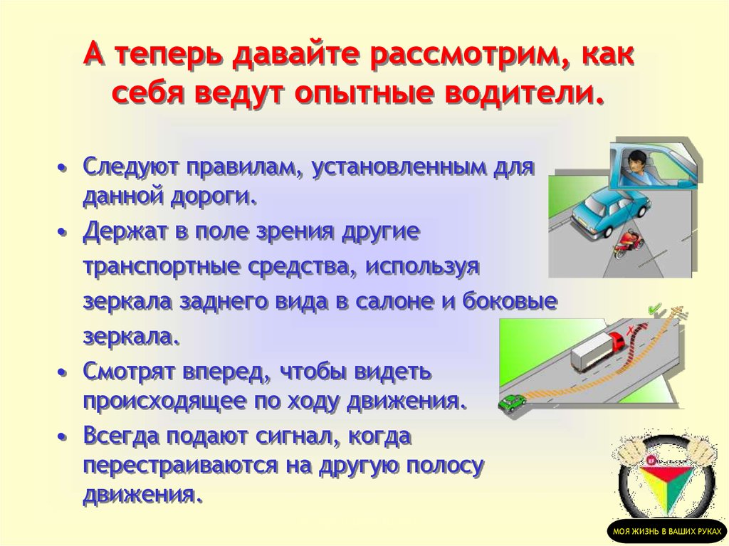 А теперь давайте рассмотрим, каксебя ведут опытные водители.