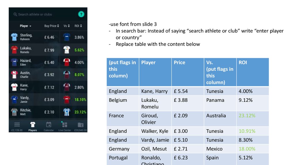 -use font from slide 3- In search bar: Instead of saying “search athlete or club” write “enter player
