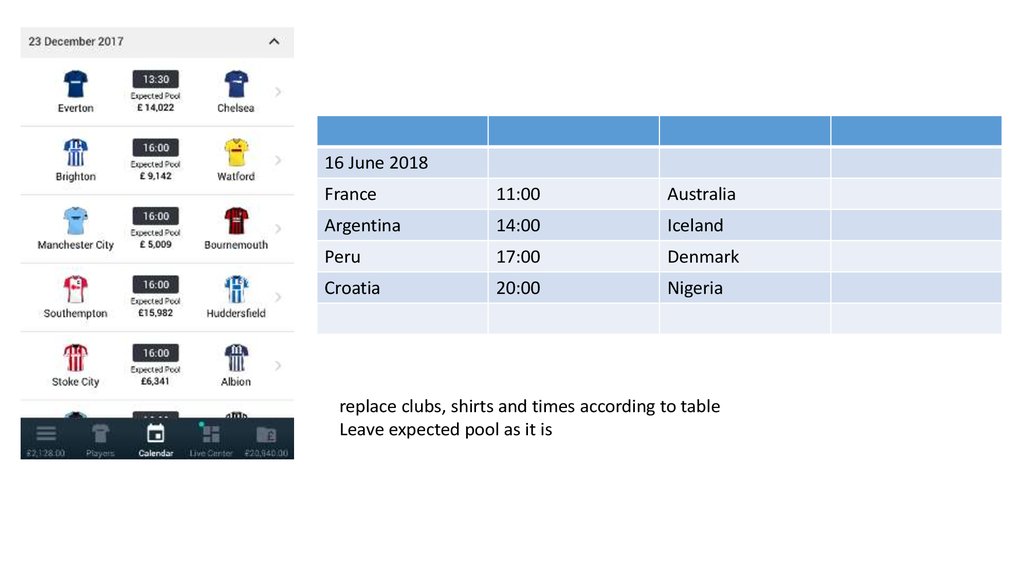 replace clubs, shirts and times according to table