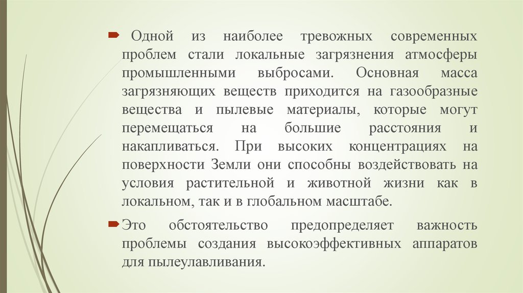 Одной из наиболее тревожных современныхпроблем стали локальные загрязнения атмосферы