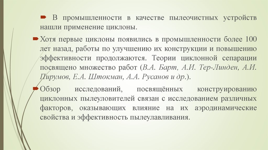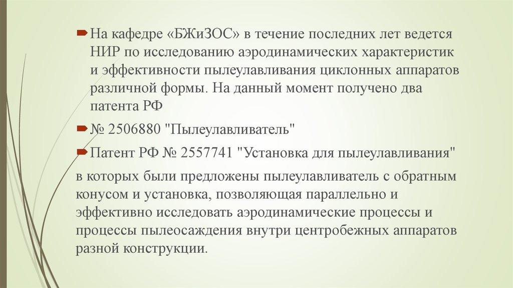 1. «Исследование газодинамических процессов в центробежных пылеуловителях с целью создания технологии проектирования экологически
