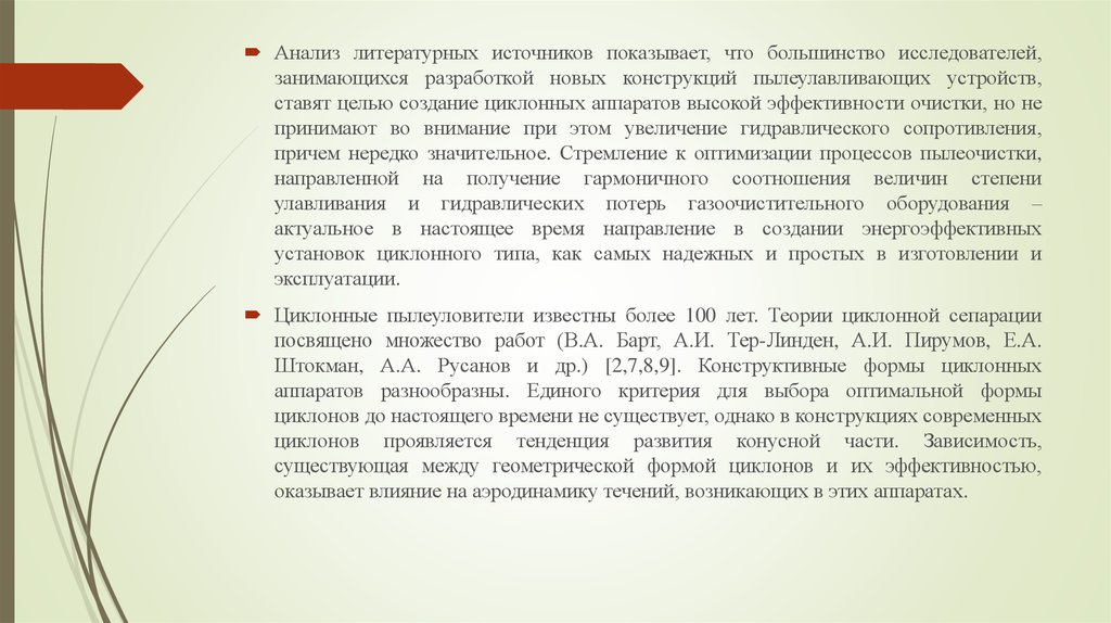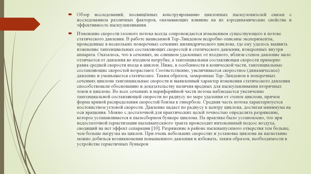 Обзор исследований, посвящённых конструированию циклонных пылеуловителей связан сисследованием различных факторов, оказывающих влияние на их аэродинамические свойства и