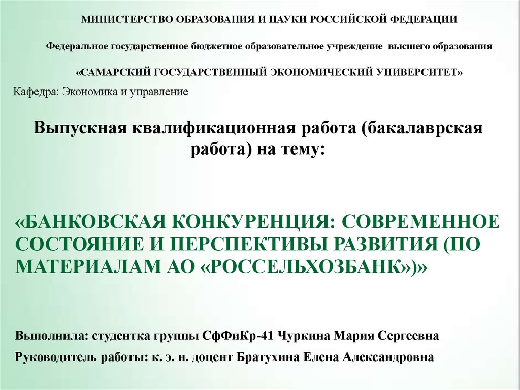 Банковская конкуренция: современное состояние и перспективы развития (по материалам АО «Россельхозбанк»)