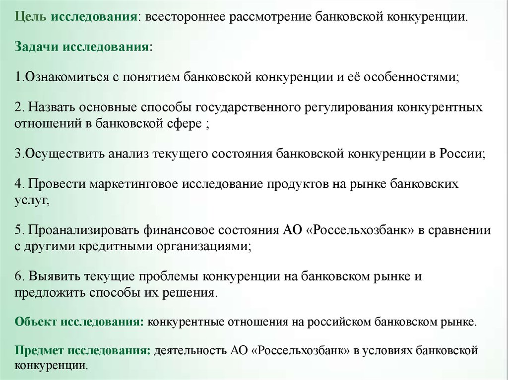Цель исследования: всестороннее рассмотрение банковской конкуренции.Задачи исследования: