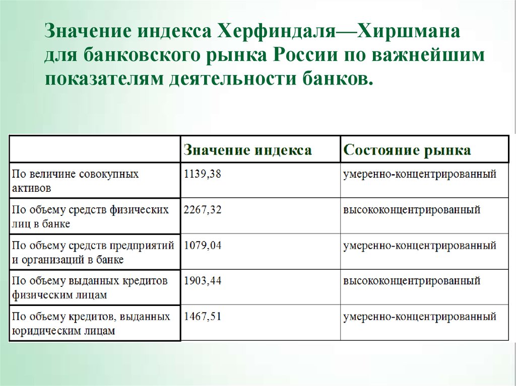 Значение индекса Херфиндаля—Хиршманадля банковского рынка России по важнейшим