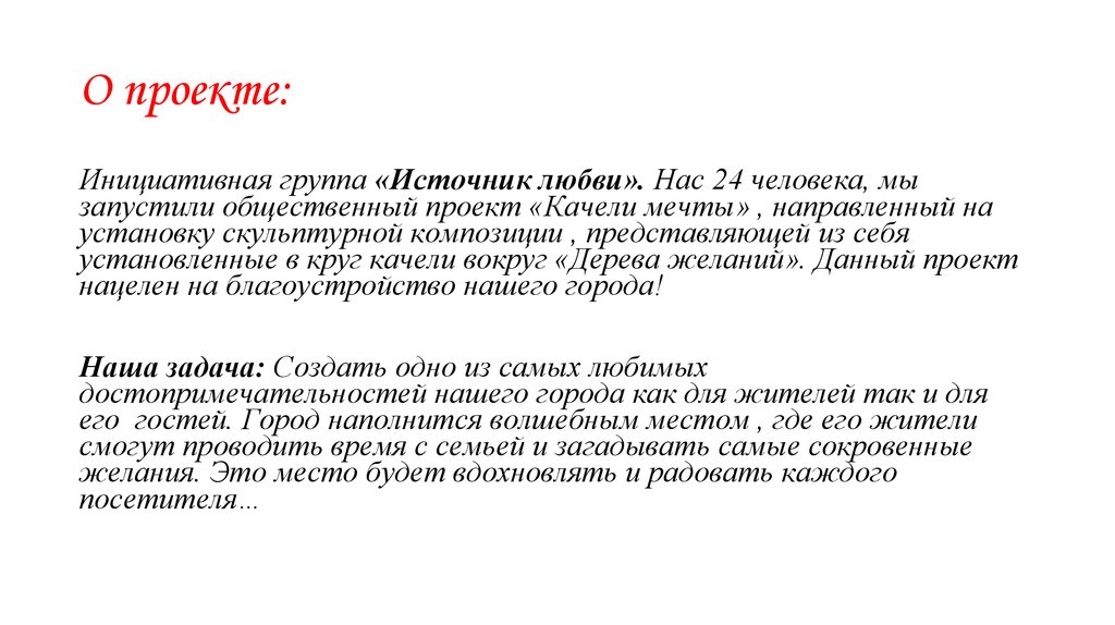 О проекте:Инициативная группа «Источник любви». Нас 24 человека, мы