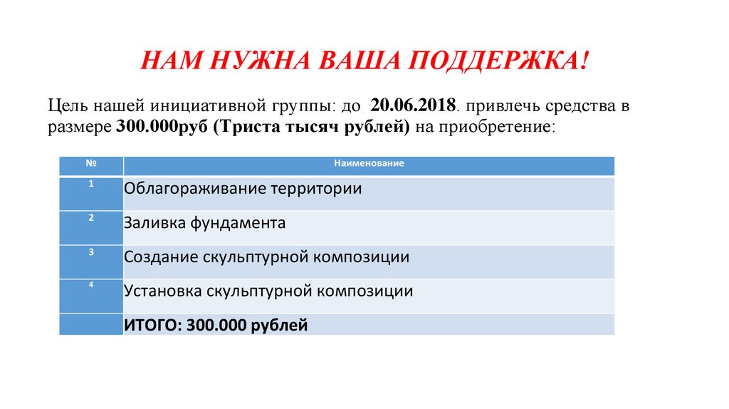 НАМ НУЖНА ВАША ПОДДЕРЖКА!Цель нашей инициативной группы: до 20.06.2018. привлечь средства в