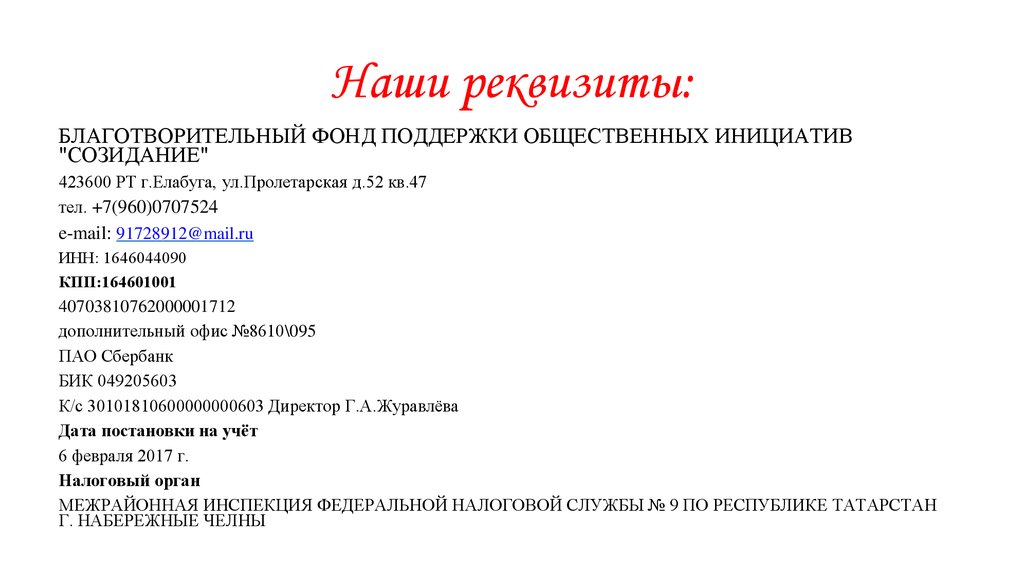 Наши реквизиты:БЛАГОТВОРИТЕЛЬНЫЙ ФОНД ПОДДЕРЖКИ ОБЩЕСТВЕННЫХ ИНИЦИАТИВ