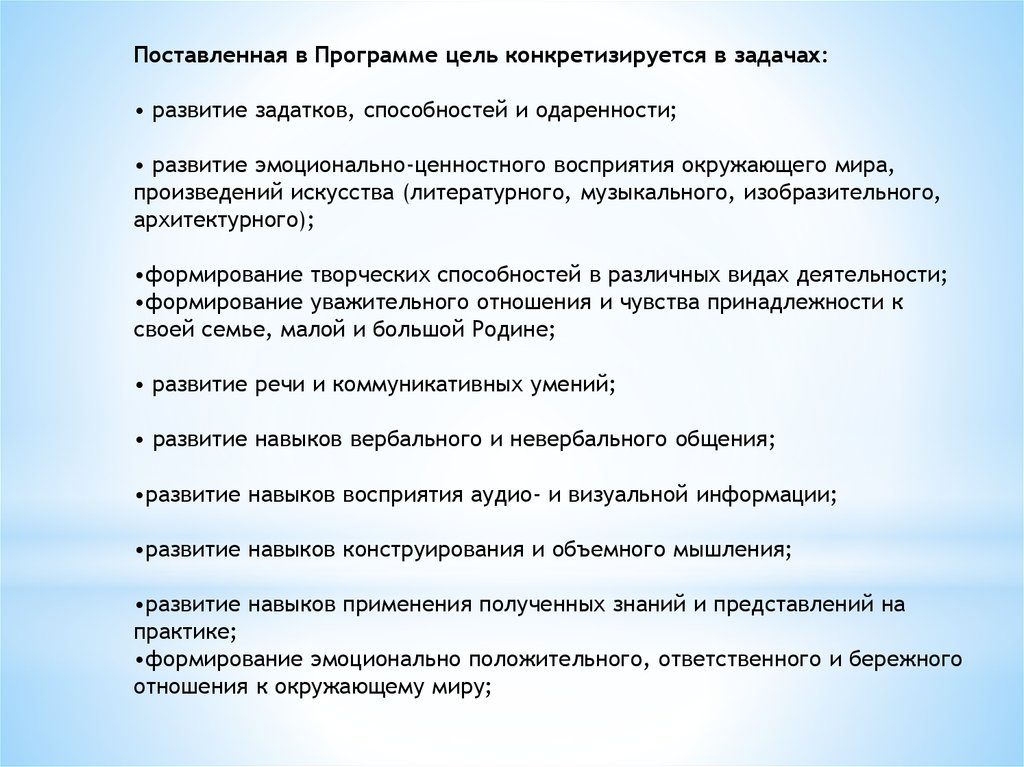 Поставленная в Программе цель конкретизируется в задачах:• развитие задатков, способностей и одаренности;