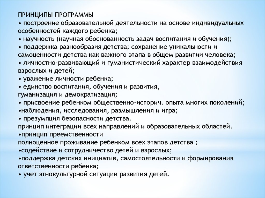 ПРИНЦИПЫ ПРОГРАММЫ• построение образовательной деятельности на основе индивидуальных