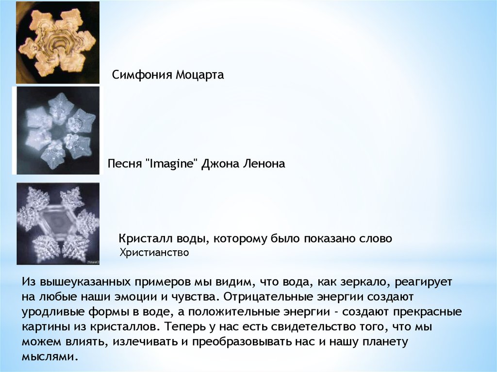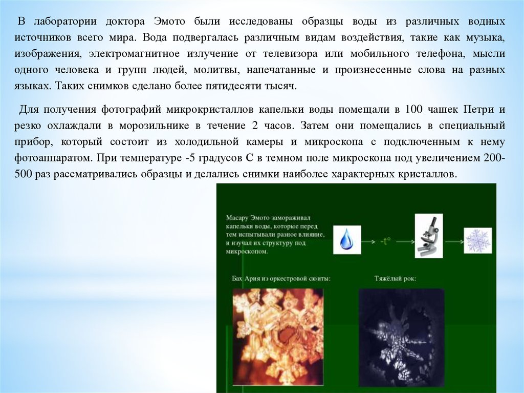 В лаборатории доктора Эмото были исследованы образцы воды из различных водныхисточников всего мира. Вода подвергалась различным видам воздействия, такие как музыка,