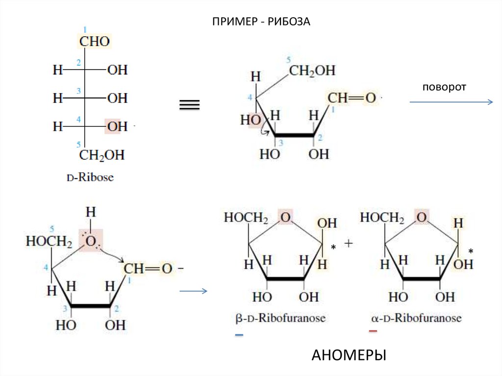 в ди- и полисахаридах (рибоза – в РНК) – ФУРАНОЗЫ