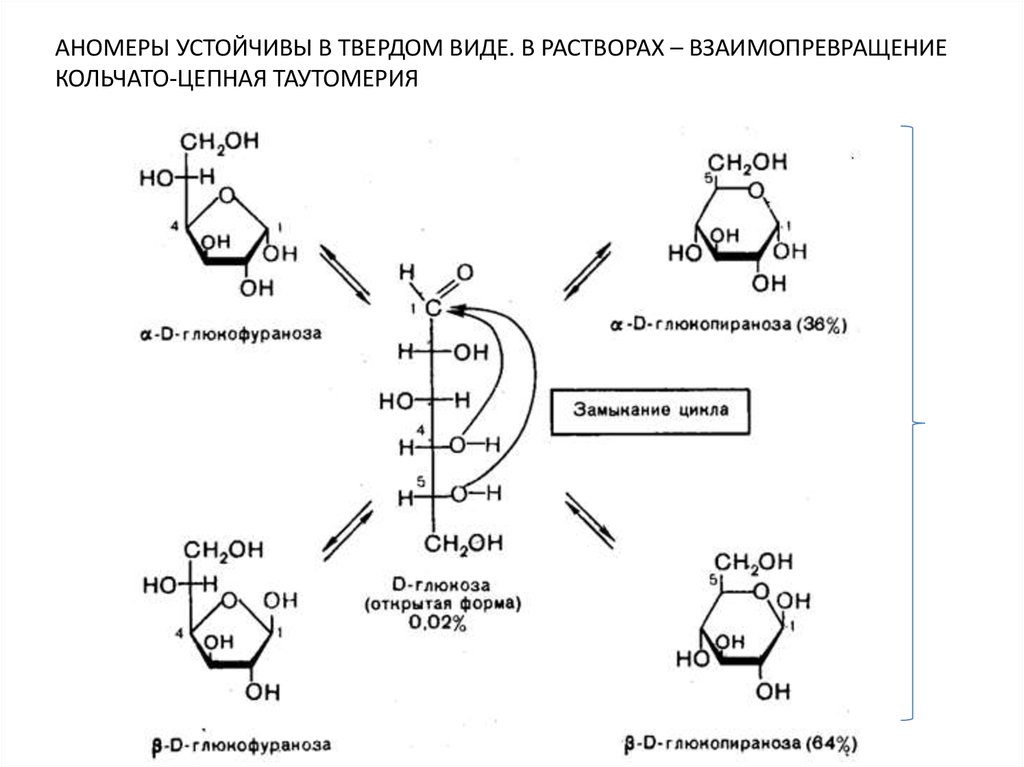 АНОМЕРЫ УСТОЙЧИВЫ В ТВЕРДОМ ВИДЕ. В РАСТВОРАХ – ВЗАИМОПРЕВРАЩЕНИЕКОЛЬЧАТО-ЦЕПНАЯ ТАУТОМЕРИЯ