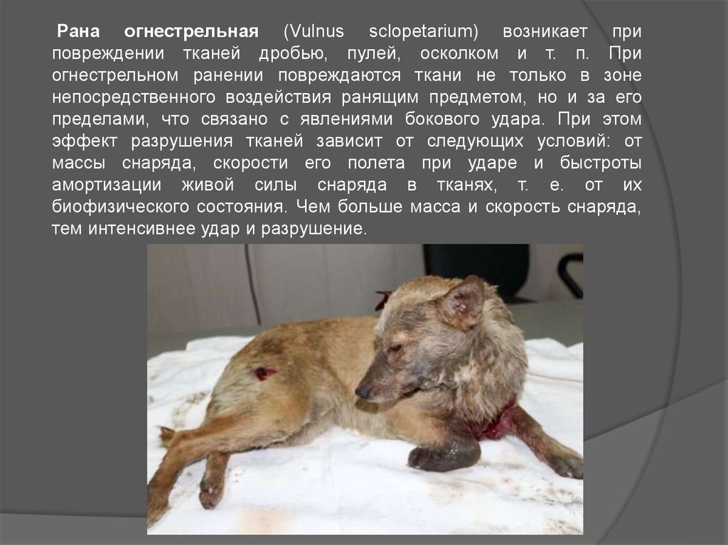 Рана огнестрельная (Vulnus sclopetarium) возникает приповреждении тканей дробью, пулей, осколком и т. п. При