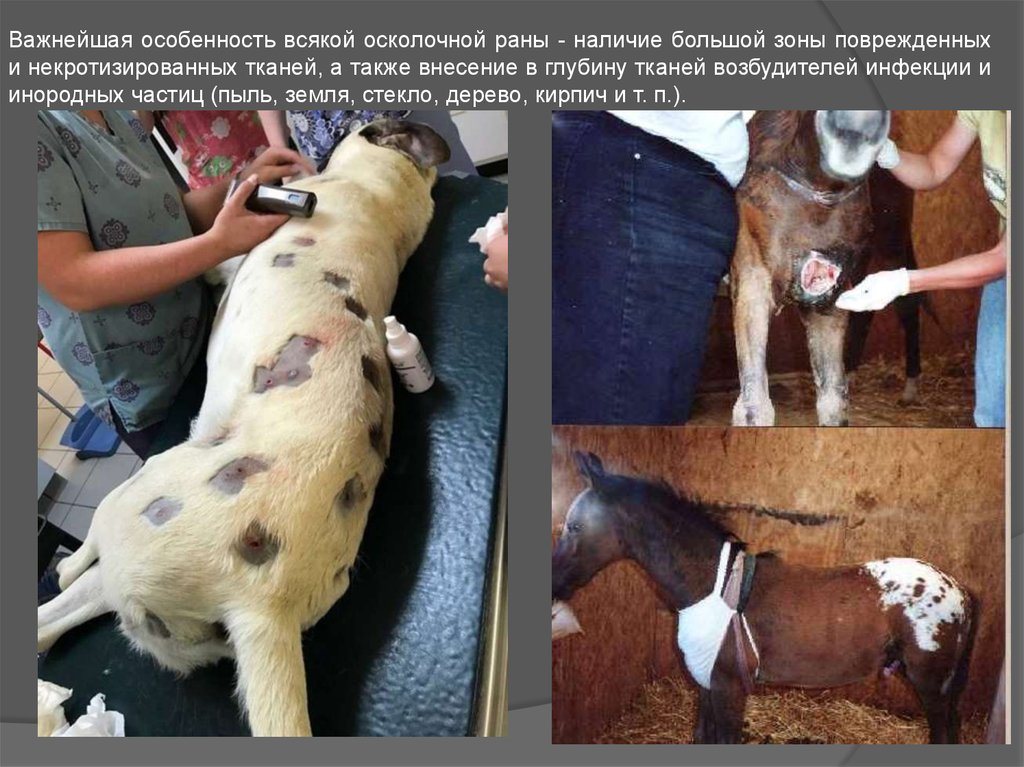 Важнейшая особенность всякой осколочной раны - наличие большой зоны поврежденныхи некротизированных тканей, а также внесение в глубину тканей возбудителей инфекции и