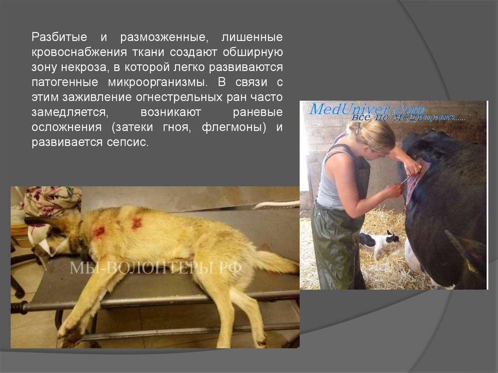 Разбитые и размозженные, лишенныекровоснабжения ткани создают обширную