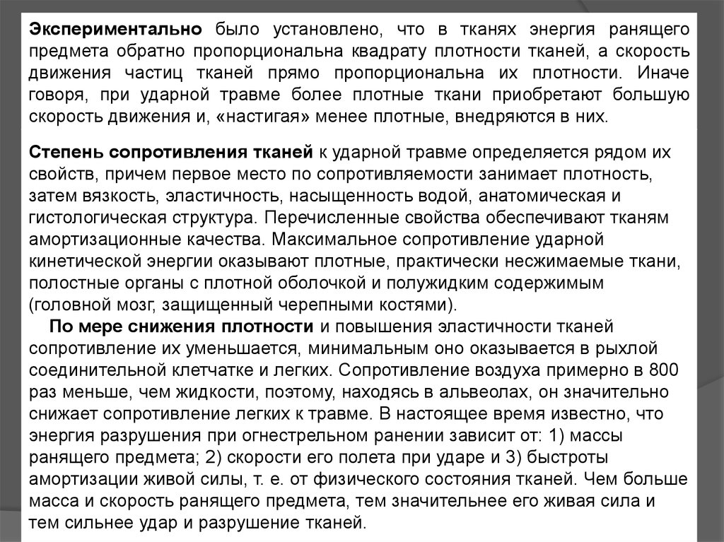 Экспериментально было установлено, что в тканях энергия ранящегопредмета обратно пропорциональна квадрату плотности тканей, а скорость