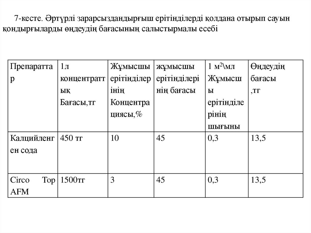 7-кесте. Әртүрлі зарарсыздандырғыш ерітінділерді қолдана отырып сауынқондырғыларды өңдеудің бағасының салыстырмалы есебі