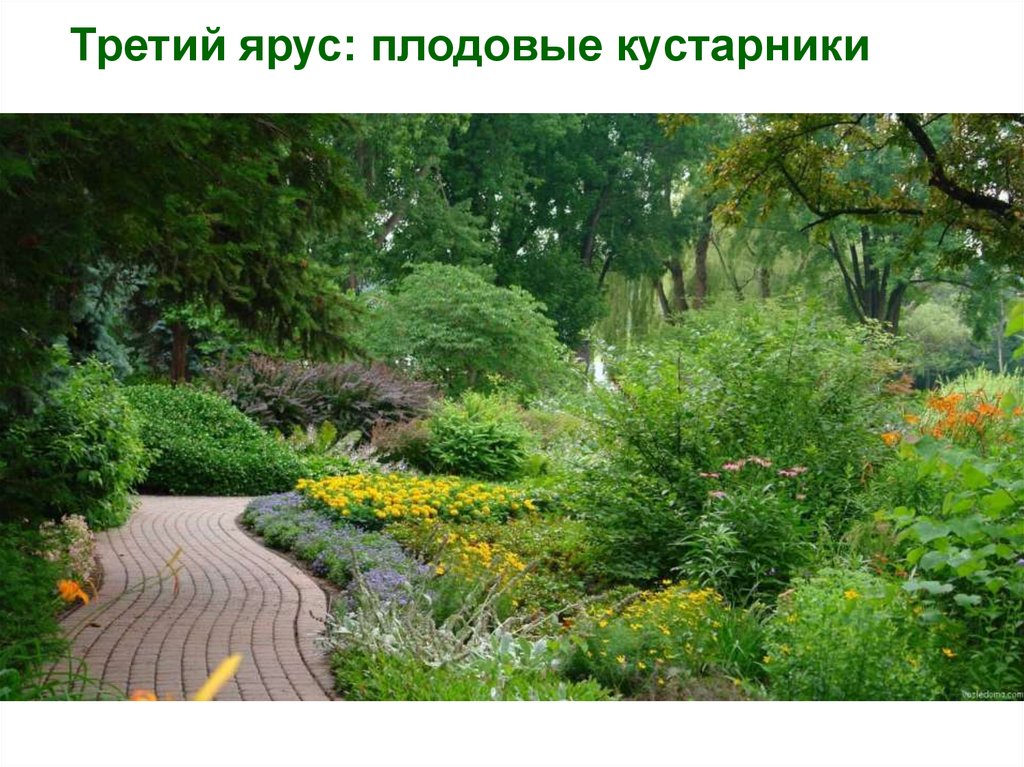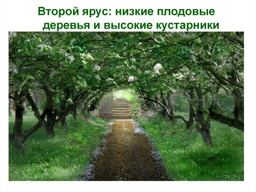 Второй ярус: низкие плодовыедеревья и высокие кустарники
