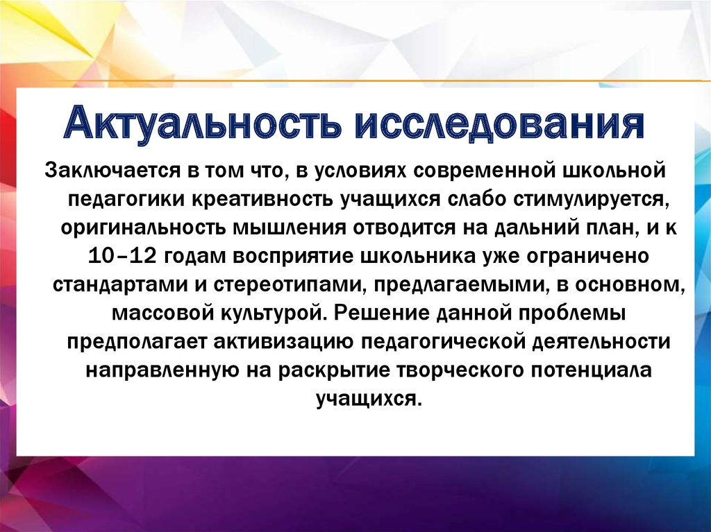 Актуальность исследованияЗаключается в том что, в условиях современной школьной