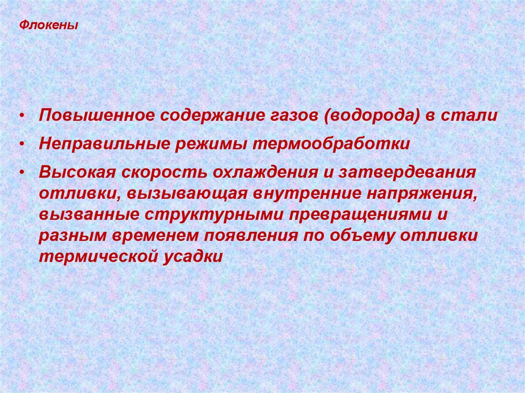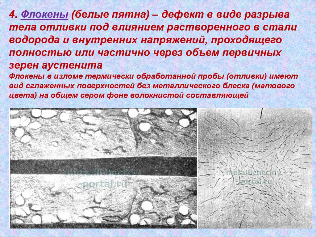 4. Флокены (белые пятна) – дефект в виде разрыватела отливки под влиянием растворенного в стали
