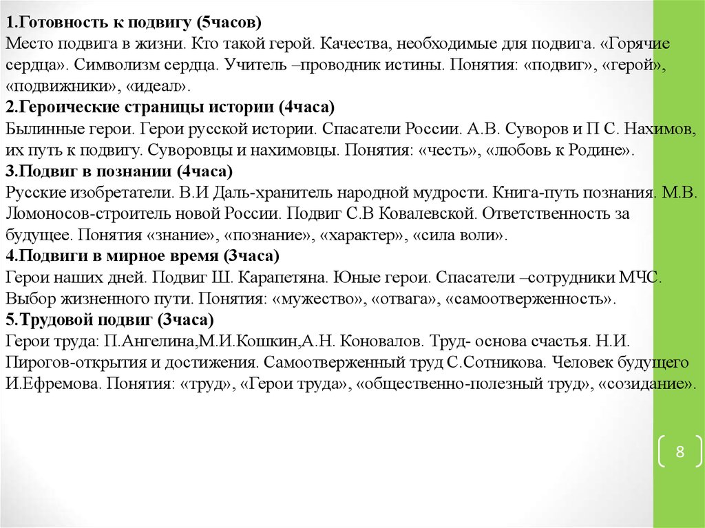 1.Готовность к подвигу (5часов)Место подвига в жизни. Кто такой герой. Качества, необходимые для подвига. «Горячие