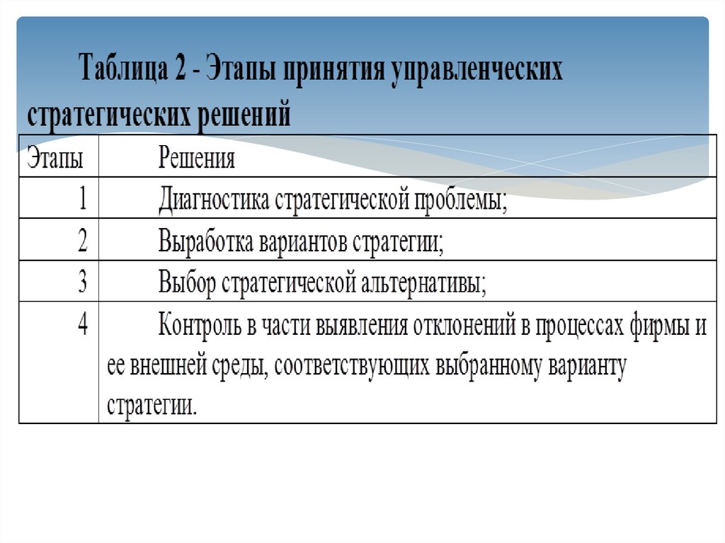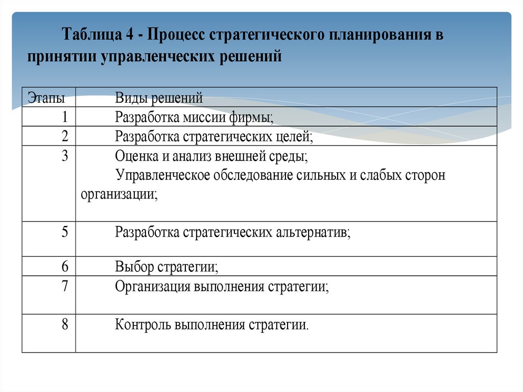 Таблица 4 - Процесс стратегического планирования впринятии управленческих решений