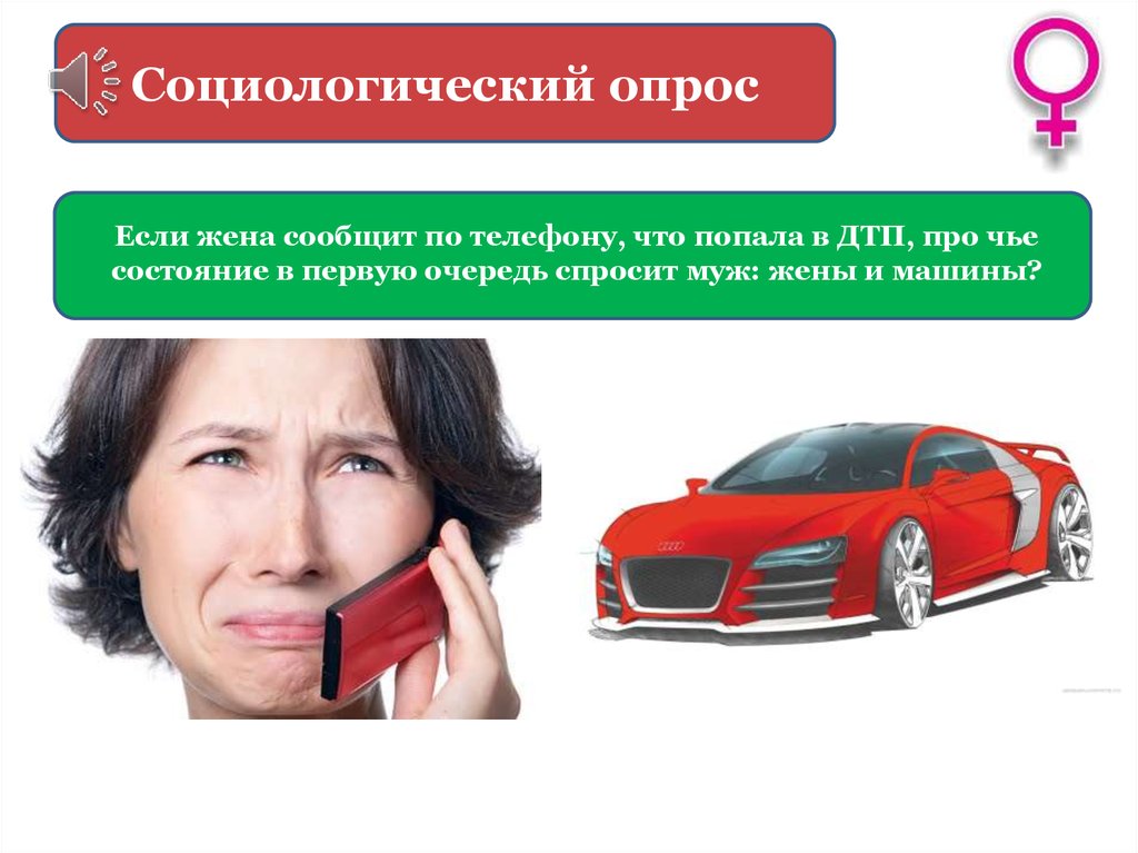Социологический опросЕсли жена сообщит по телефону, что попала в ДТП, про чье
