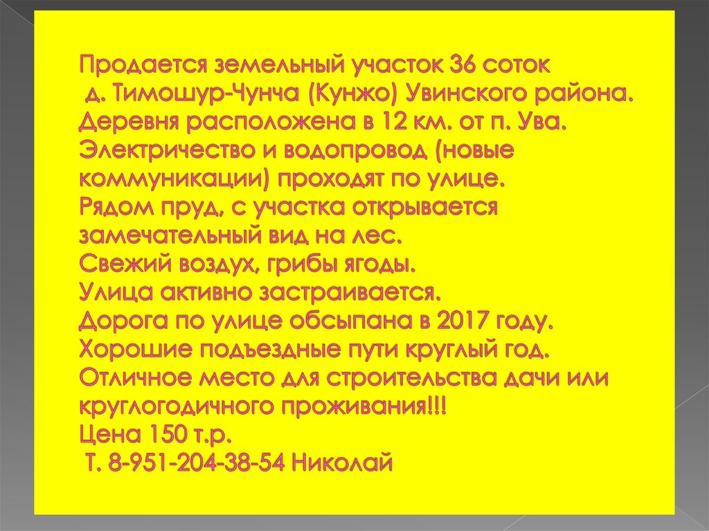 Продается земельный участок 36 соток д. Тимошур-Чунча (Кунжо) Увинского района. Деревня расположена в 12 км. от п. Ува.