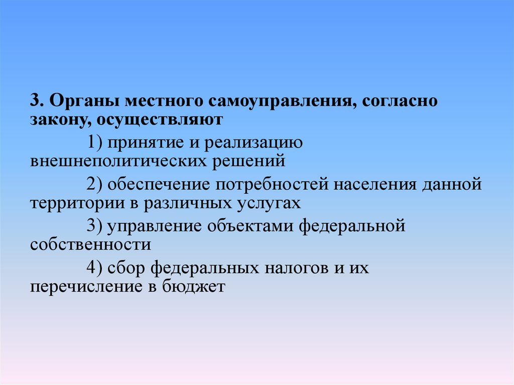 3. Органы местного самоуправления, согласнозакону, осуществляют