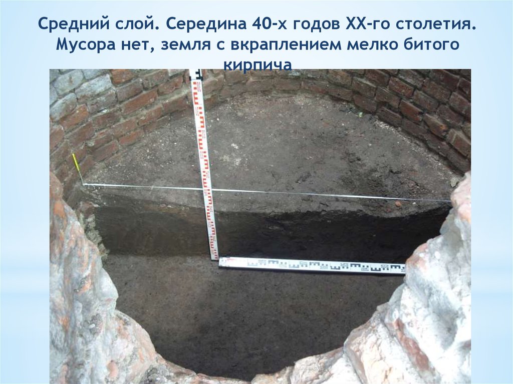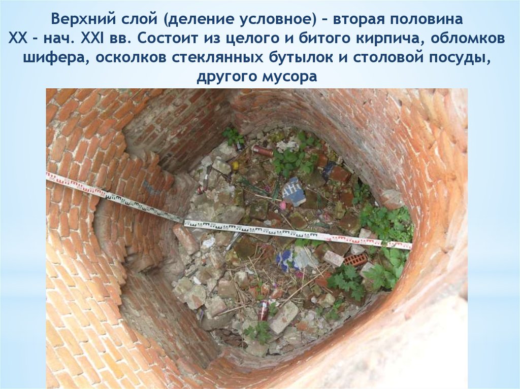 Верхний слой (деление условное) – вторая половинаXX - нач. XXI вв. Состоит из целого и битого кирпича, обломков